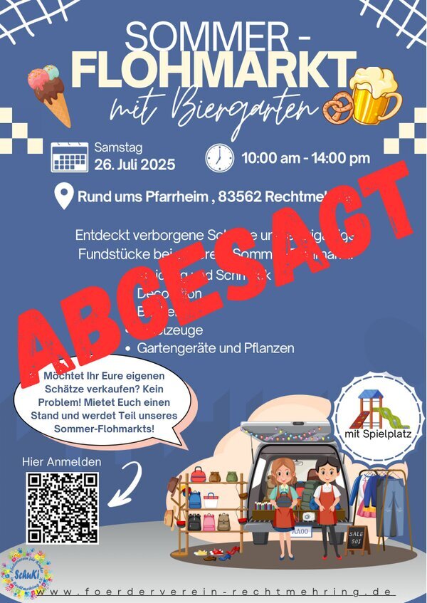 (Abgesagt) Sommer Flohmarkt Förderverein für Kinder in Rechtmehring e.V.Veröffentlicht von Förderverein für Kinder in Rechtmehring e.V. in Flohmarkt · Samstag 28 Jun 2025 · Lesezeit 1:00 Der Flohmarkt wurde aufgrund der Wettervorhersage abgesagt!